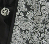 Boys Sherwani suit in black and silver Comes with black silk scarf with a brooch. drawstring churidar style black pants in cotton-silk. Perfect for formal occasions. 4 Pcs - Sherwani, Pants, scarf, brooch |